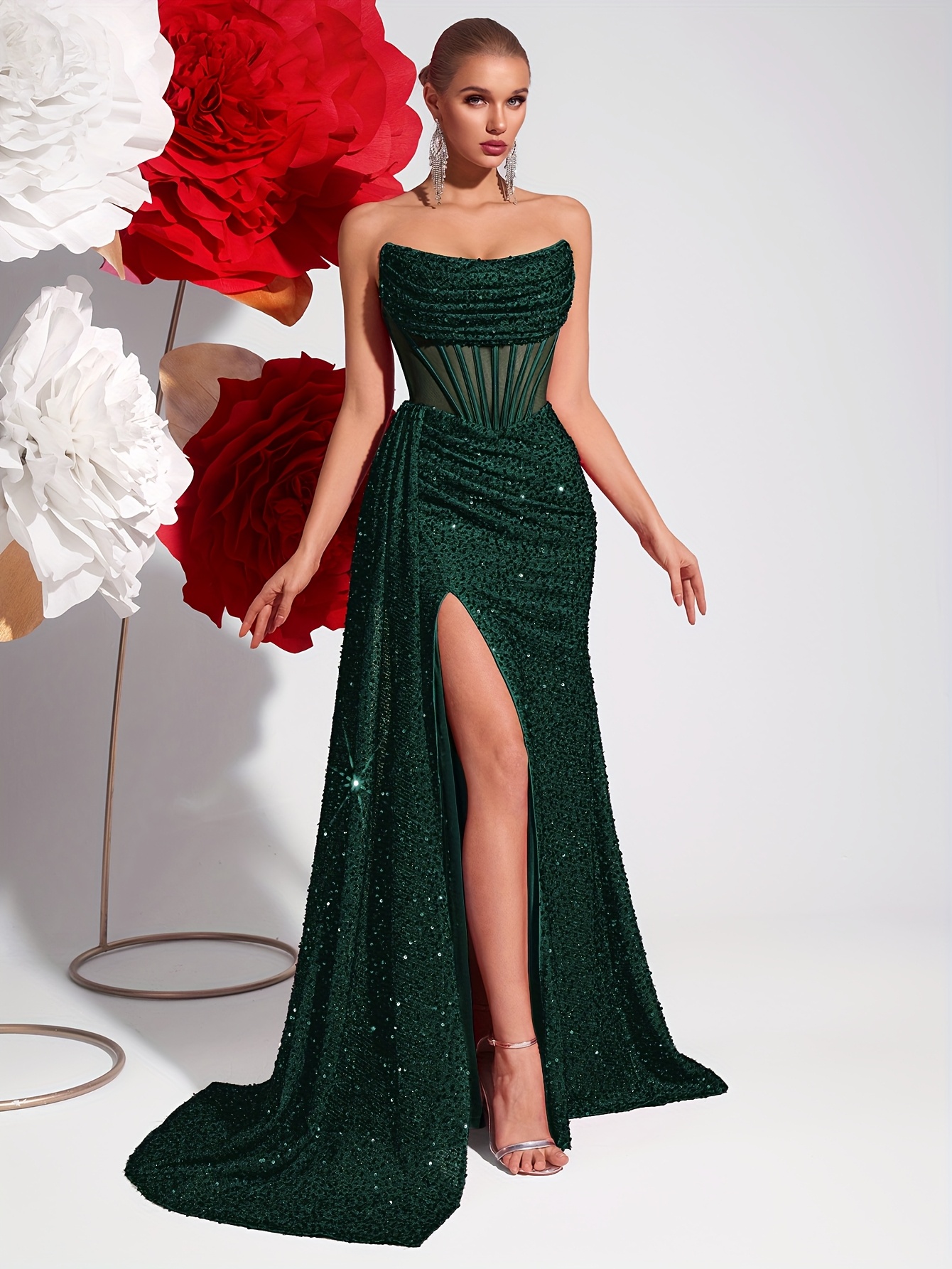 The strapless sweetheart neckline offers excellent support while showcasing your décolletage beautifully. The structured bodice ensures comfort and confidence throughout your event.